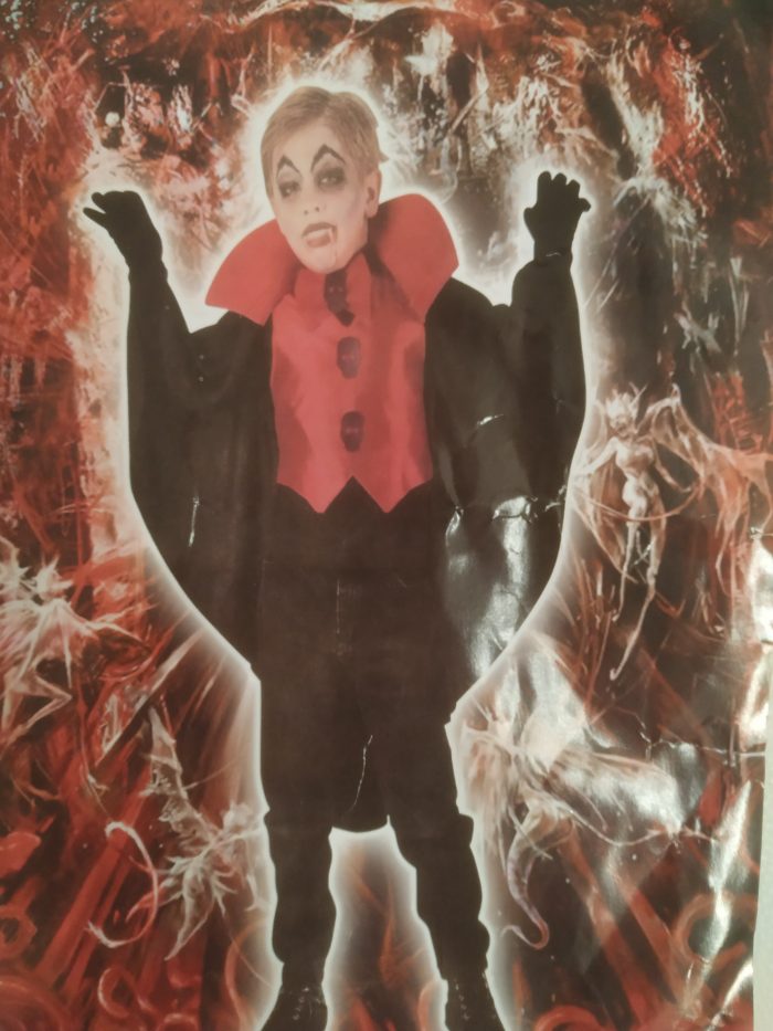 VAMPIR KOSTUM, HLAČE, OGRINJALO, MAJICA, METULJČEK